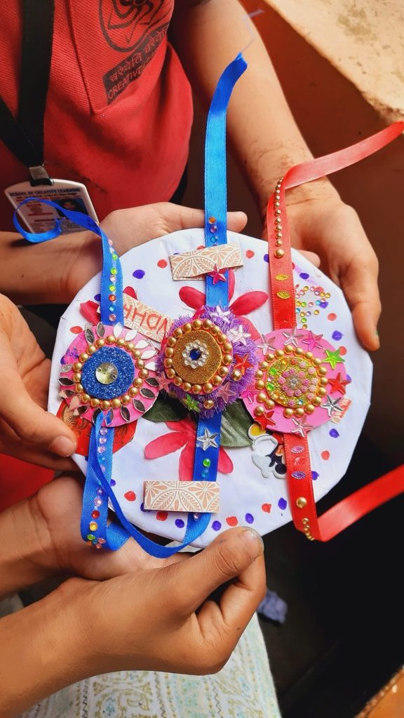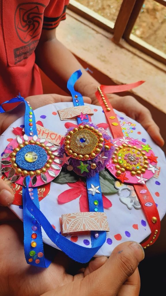 बच्चों को प्रोत्साहित किया गया कि वे अपनी राखी स्वयं तैयार करें। इसके लिए राखी बनाने की नवीन तकनीकों, डिज़ाइनों और कलात्मक विधियों का परिचय कराया गया, जिससे उनकी रचनात्मकता और हाथों की दक्षता दोनों विकसित हों।