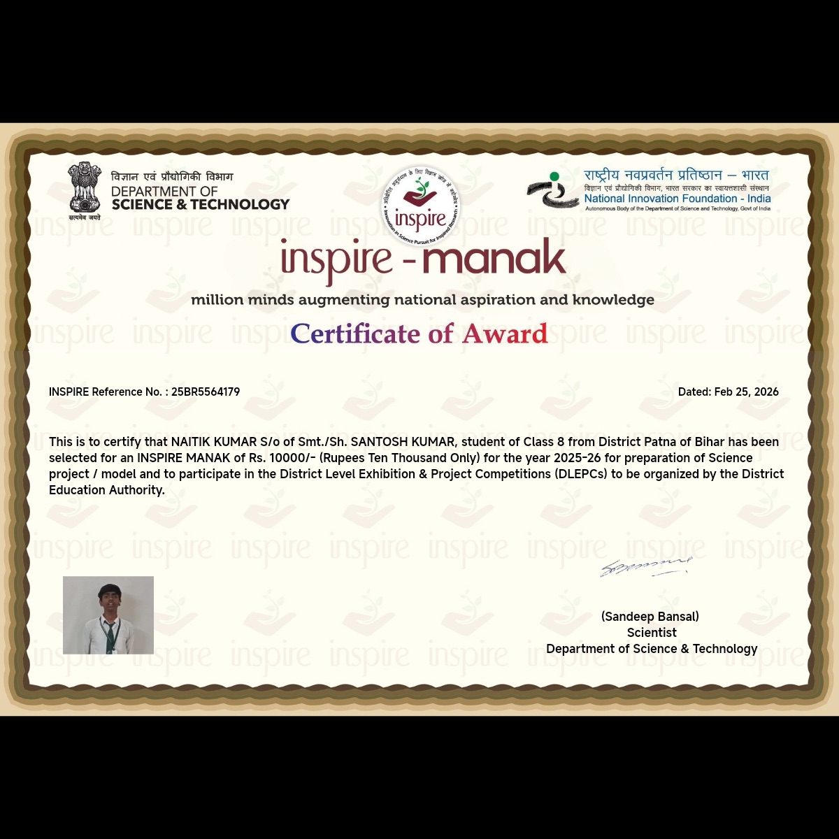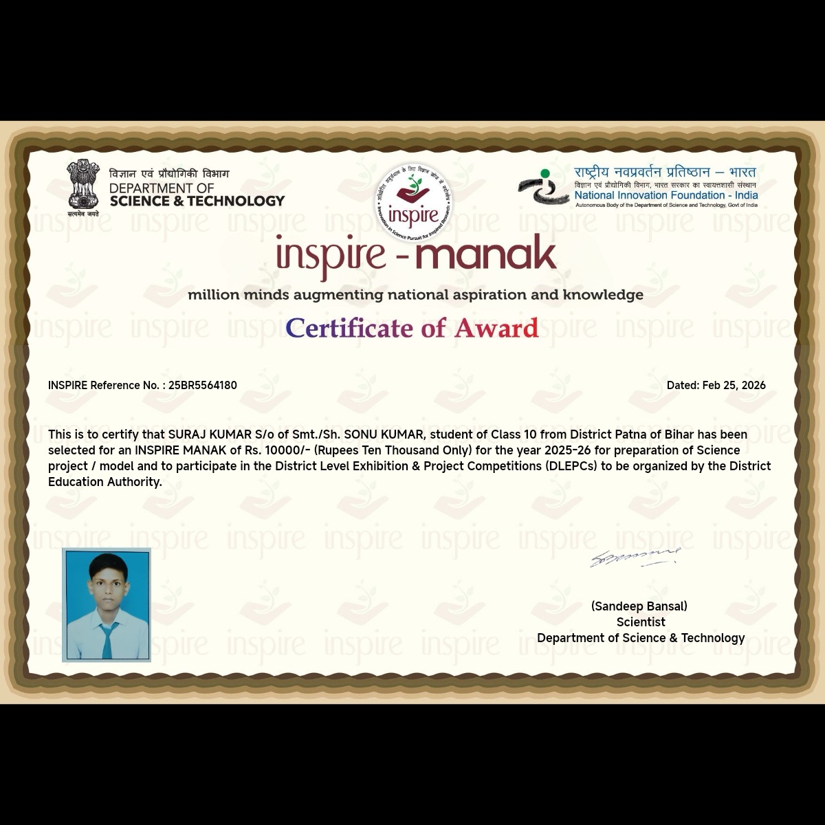 These students have been selected for the 2025-26 INSPIRE-MANAK award, each receiving a ₹10,000 grant to bring their scientific visions to life.