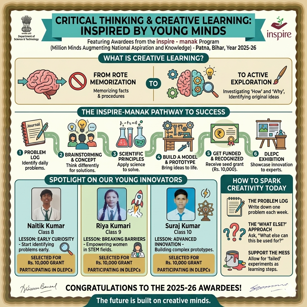 The INSPIRE-MANAK scheme, executed by the Department of Science & Technology (DST) and the National Innovation Foundation (NIF), perfectly matches the mission of the School of Creative Learning. It encourages students to:
